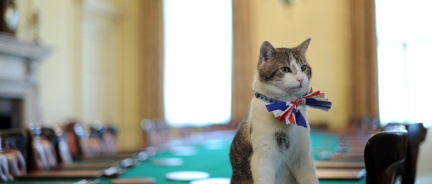 Larry, the 10 Downing Street cat, sits on the cabinet table wearing a British Union Jack bow tie ahead of the Downing Street street party, in central London, on April 28, 2011. Downing Street will hold a street party tomorrow to celebrate the royal wedding of Britain's Prince William and Kate Middleton at Westminster Abbey, on April 29, 2011. AFP PHOTO/BEN STANSALL/WPA POOL (Photo credit should read BEN STANSALL/AFP/Getty Images)